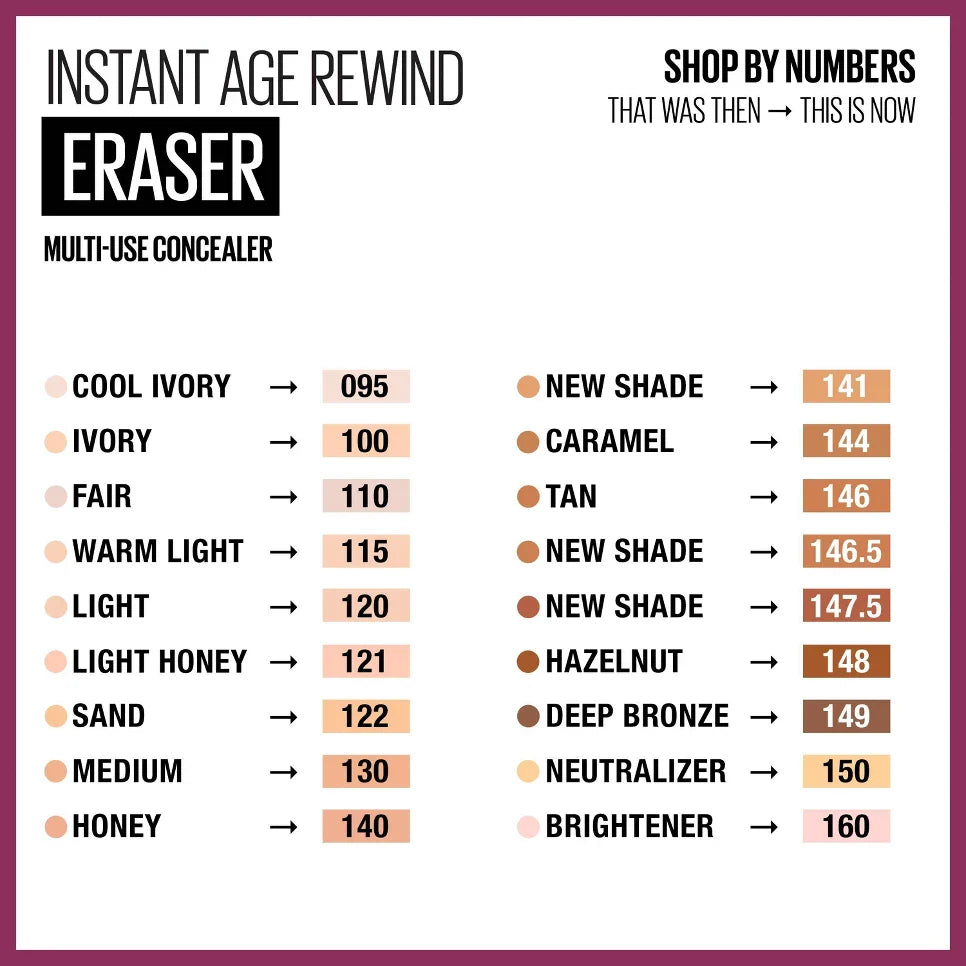 Maybelline Instant Age Rewind Concealer: America's Number 1 Concealer; Erase the look of dark circles, correct the appearance of redness and brighten the look of dull skin with Instant Age Rewind Eraser multi-use dark circle concealer