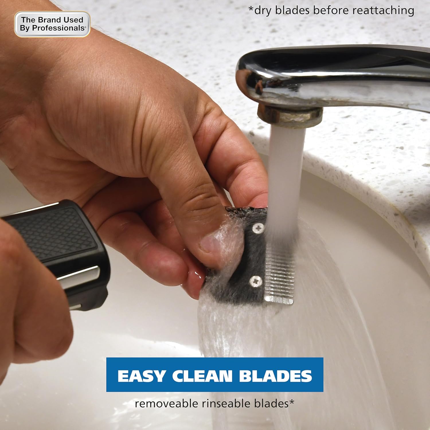 - Easy Clean Blades – The removable stainless steel self-sharpening blades allow you to easily rinse off hair under the sink to keep your blades clean.