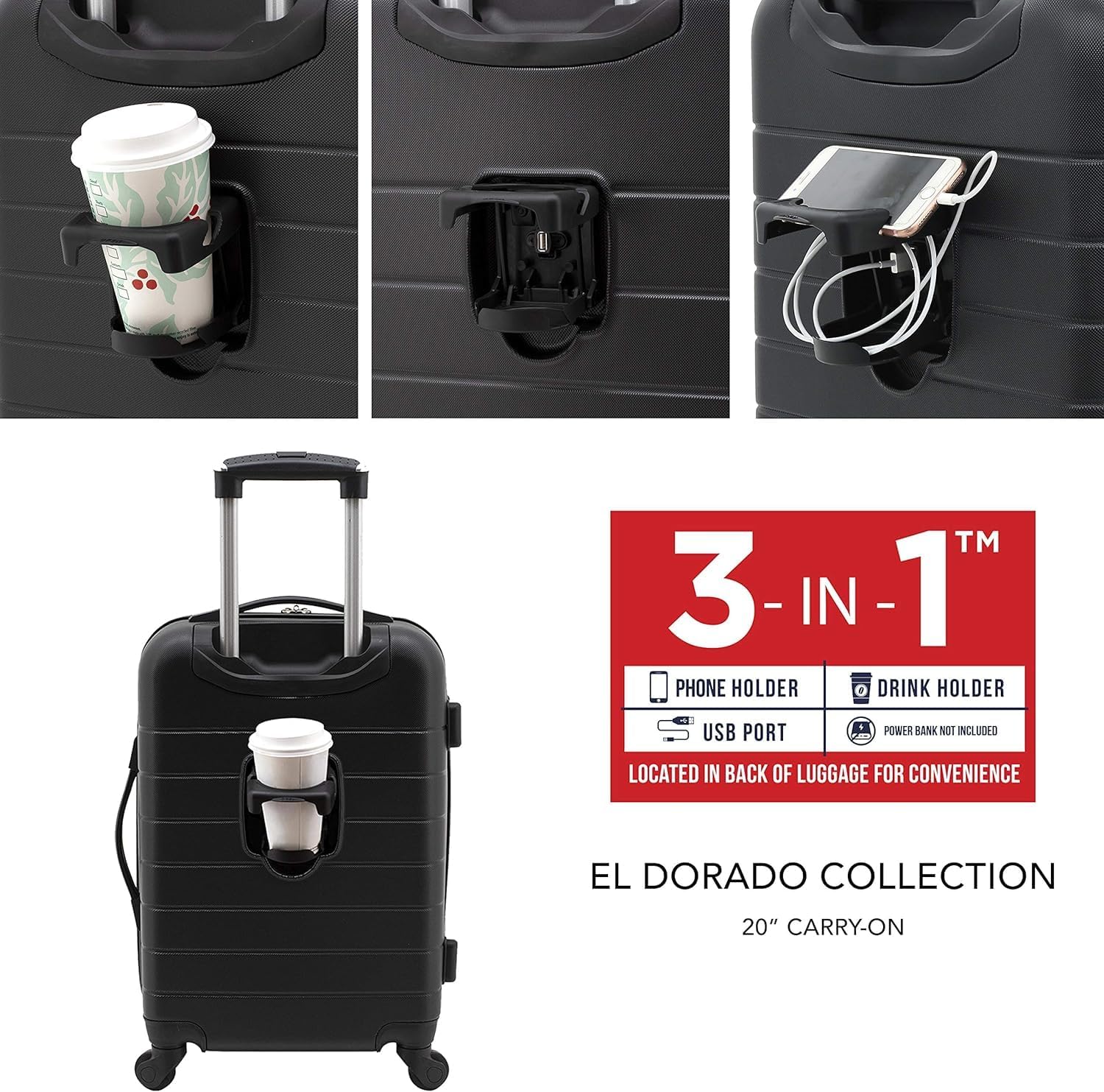 Featuring the Wrangler EL DORADO Smart Luggage set with the 3-in-1 Cup holder, phone holder, and USB port for charging devices. Battery pack is not included. Size options include 3 Piece Set (28" Large check-in, 24" Large check-in, 20" Carry on) or standalone units. All sizes of the luggage have the 3-in-1 feature and come nested. Built for the ultimate convenient experience for the modern day traveler.