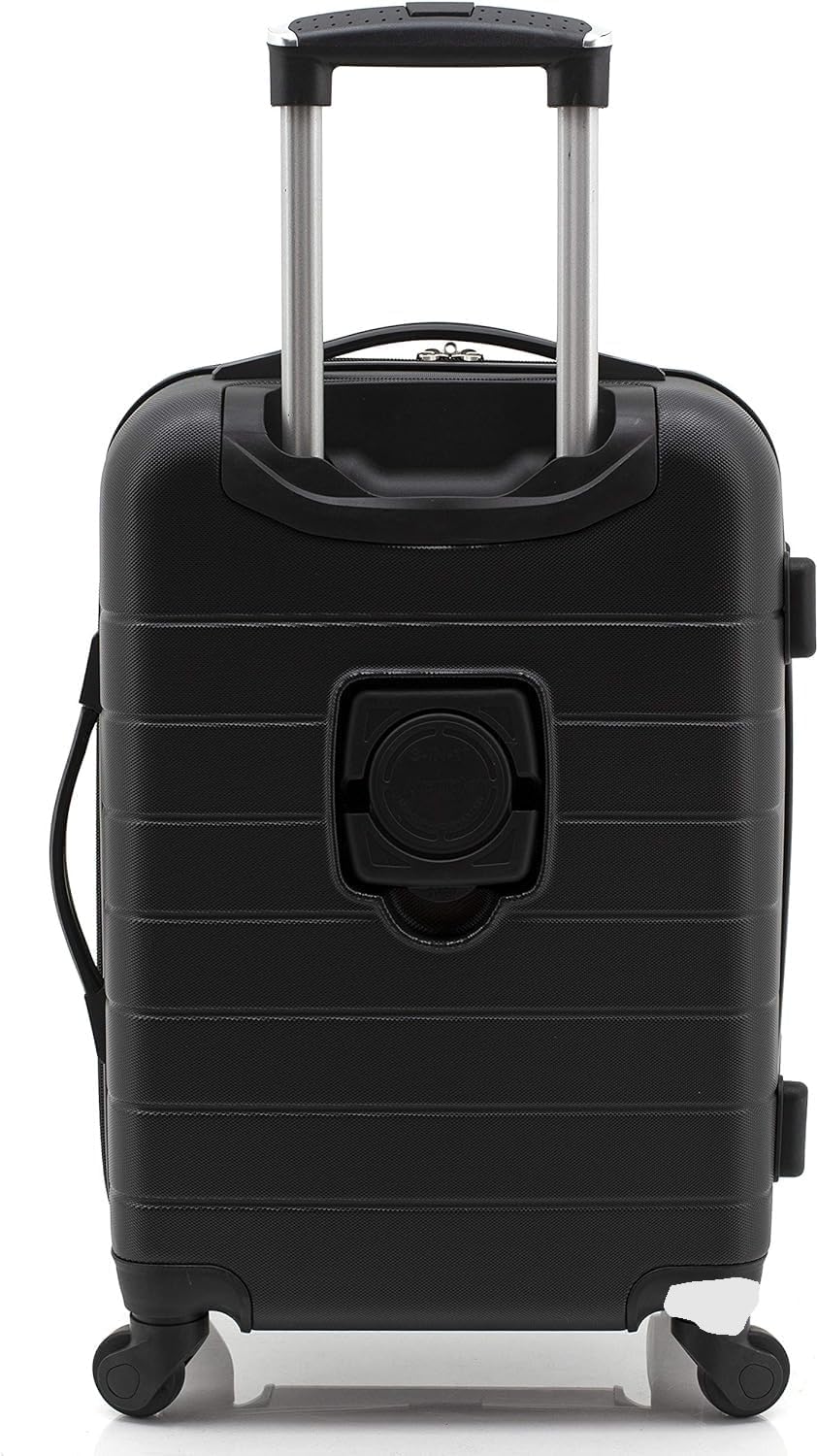 - Patented 3-in-1 cup holder, USB port, and phone holder located in back of luggage for travel convenience